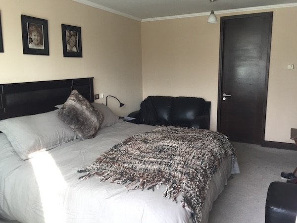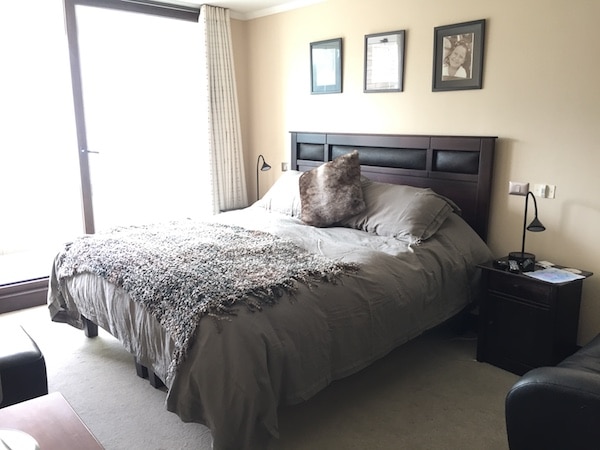 Dormitorio principal en suite con terraza independiente con cierre de vidrio, walking y baño.