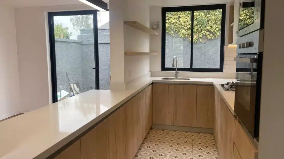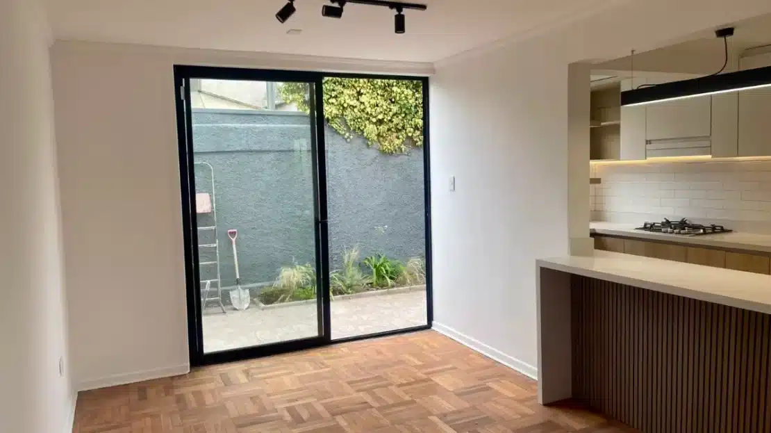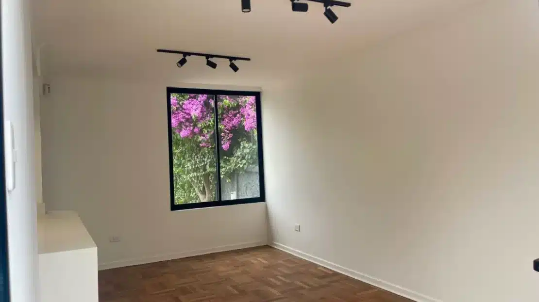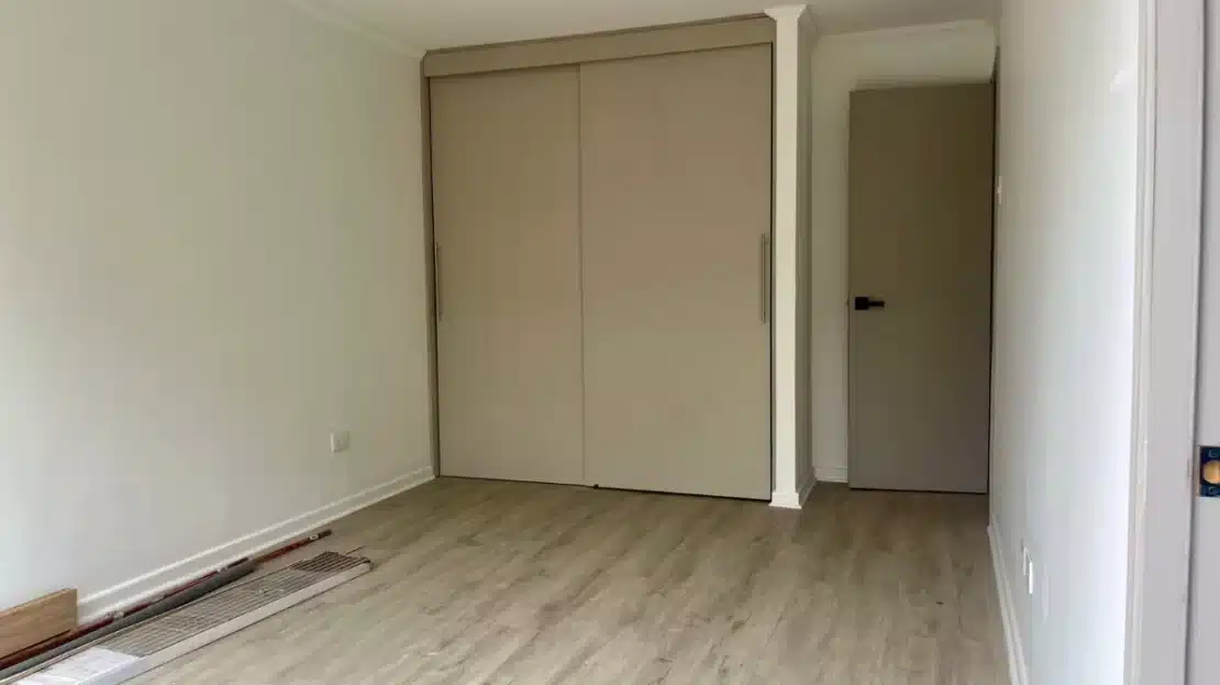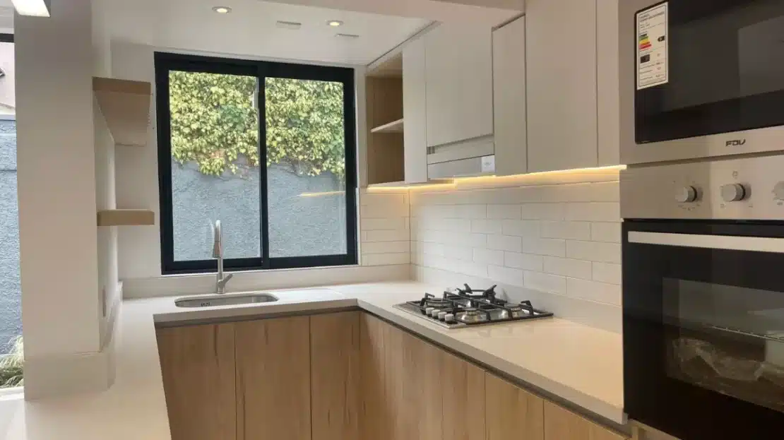 Piso flotante en dormitorios + ventanas termopanel + equipada con horno + encimera + campana + cerco eléctrico + alarma + cuarzo en cocina + porcelanato en baños + shower + luminaria.